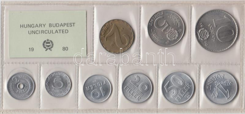 1980. 2f-10Ft 9db klf érmés forgalmi sor fóliatokban T:1 https://www.darabanth.com/de/191-Fernauktion/191.0/Numismatik/Ungarische-Munzen~200010/1980-2f-10Ft-9db-klf-ermes-forgalmi-sor-foliatokban-T1~II721313