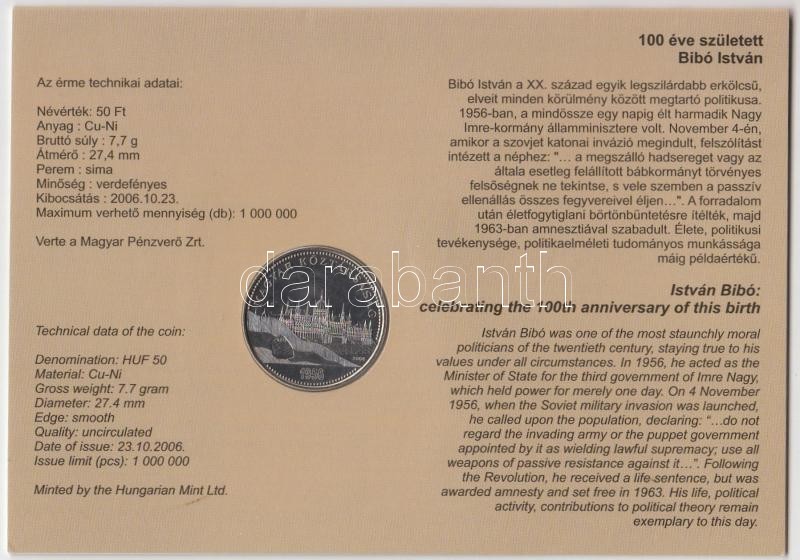 2006. 50Ft "100 éve született Bibó István" emlékkiadás emléklapon T:1 https://www.darabanth.com/de/191-Fernauktion/191.0/Numismatik/Ungarische-Munzen~200010/2006-50Ft-100-eve-szuletett-Bibo-Istvan-emlekkiadas-emleklapon-T1~II721375