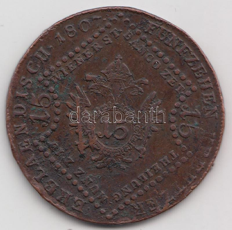 Ausztria/magyar verdejel 1807E 15Kr Cu T:2- https://www.darabanth.com/de/191-Fernauktion/191.0/Numismatik/Ungarische-Munzen~200010/Ausztriamagyar-verdejel-1807E-15Kr-Cu-T2-~II721674
