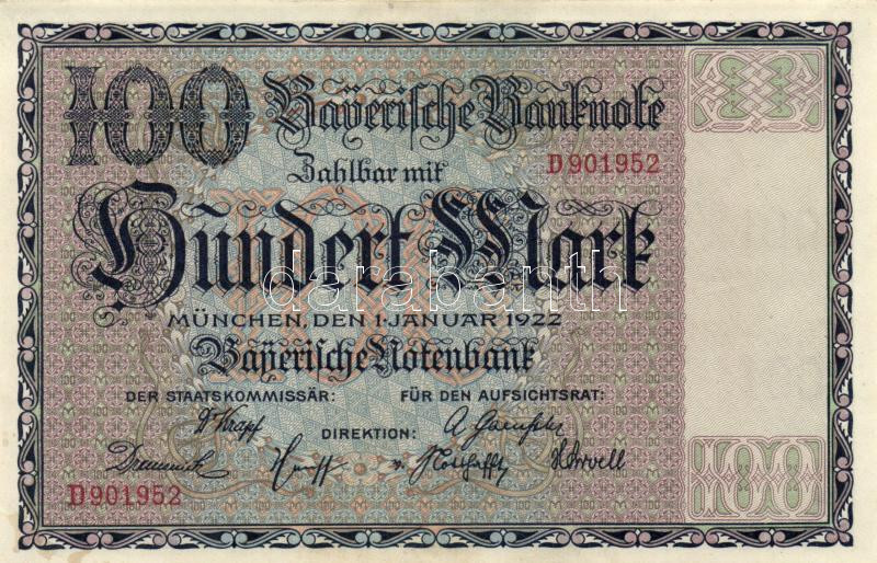 Germany-Weimar Republic / München / Bayerische Notenbank 1922. 100 Mark C:AU(small stain)