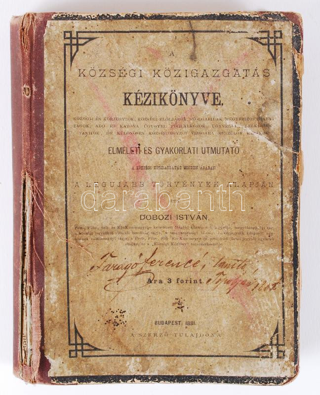 Beschreibung: Dobozi István: A községi közigazgatás kézikönyve. Elméleti és gyakorlati útmutató. Bp, 1881. A szerző tulajdona, (viseltes állapotban)