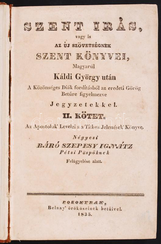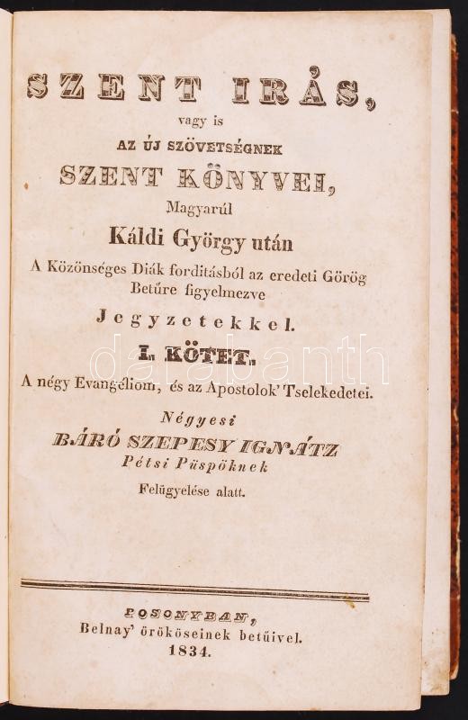 Szent Irás, vagy is az Új Szövetségnek szent könyvei, Magyarúl Káldi György után A Közönséges Diák forditásból az eredeti Betűre is figyelmezve Jegyzetekkel. Négyesi báró Szepesy Ignátz Pétsi Püspöknek Felügyelése alatt. I-II. kötet.