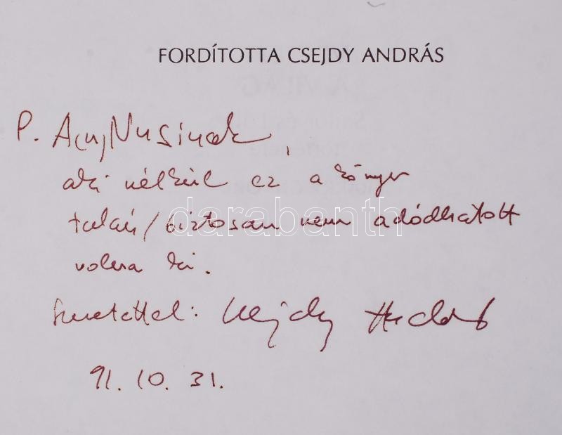 Barry Gifford: Veszett világ. Csejdy András fordító által dedikált. Bp... https://www.darabanth.com/de/192-Fernauktion/192.0/Andere-Sammelgebiete/Bucher-Sonstige-Raritaten~2000038/Barry-Gifford-Veszett-vilag-Csejdy-Andras-fordito-altal-dedikalt-Bp-1991-Montazs~II725480