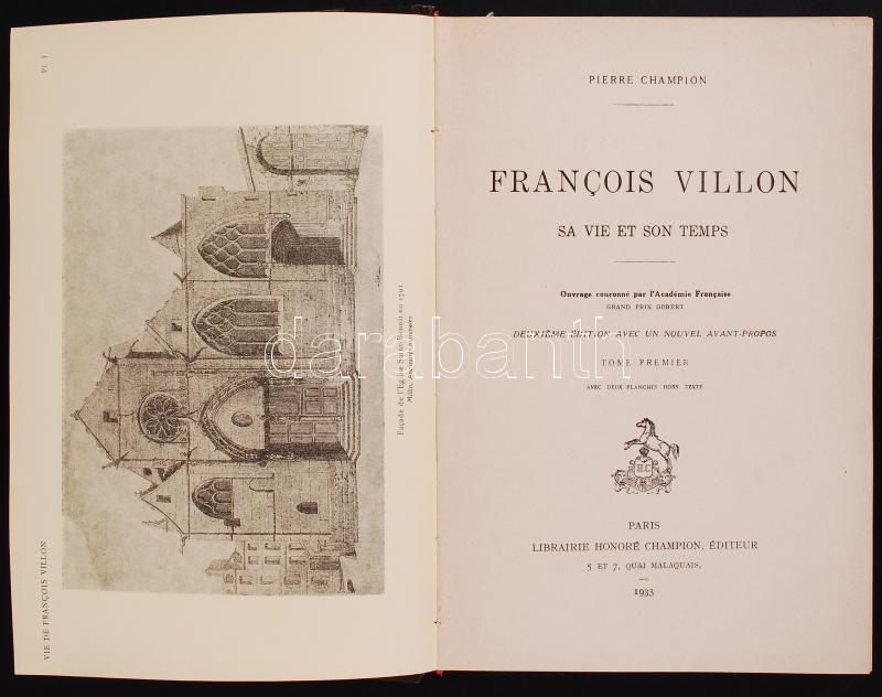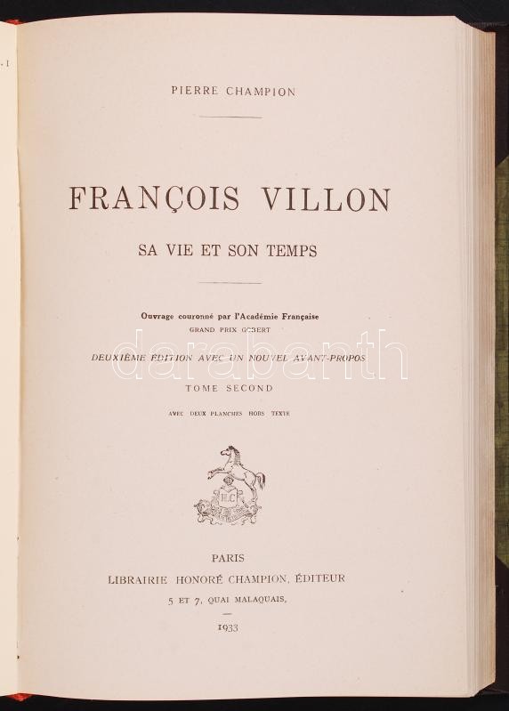 Champion, Pierre: Francois Villon. Sa vie et son temps. Tome I et II. Deuxieme edition avec un nouvel avant-propos. Paris, 1933, Librairie Honoré Champion. Egybekötve, amatőr félvászon kötésben, illusztrációkkal /