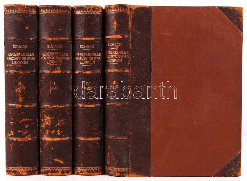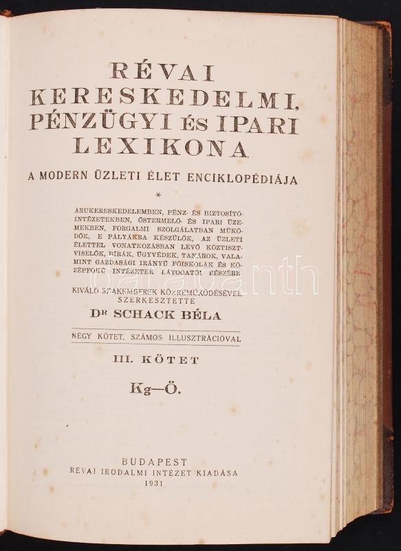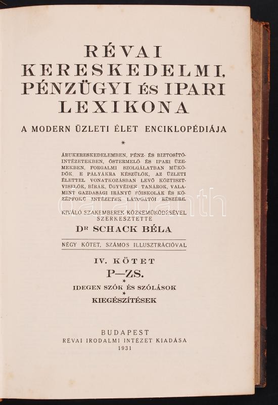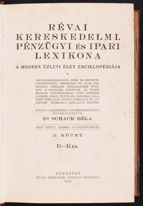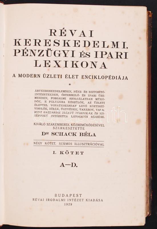 Révai kereskedelmi, pénzügyi és ipari lexikona. A modern üzleti élet enciklopédiája. Négy kötet, számos illusztrációval. I-IV. Szerk. Schack Béla. Bp., 1929-1931, Révai. Korabeli egységes, aranyozott gerincű félbőr kötésben, márványozott lapszélekkel (a bőr kopottas)