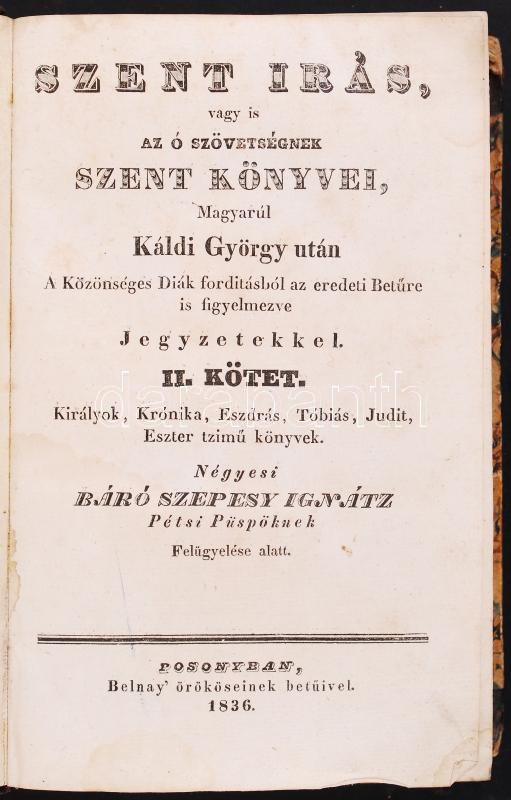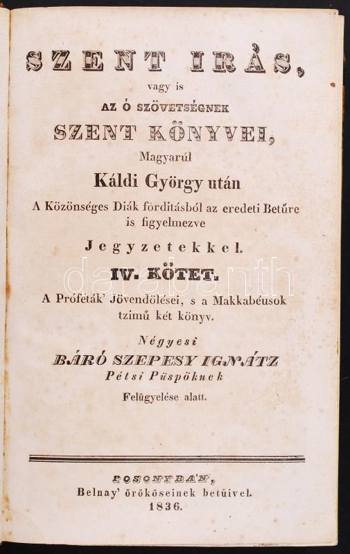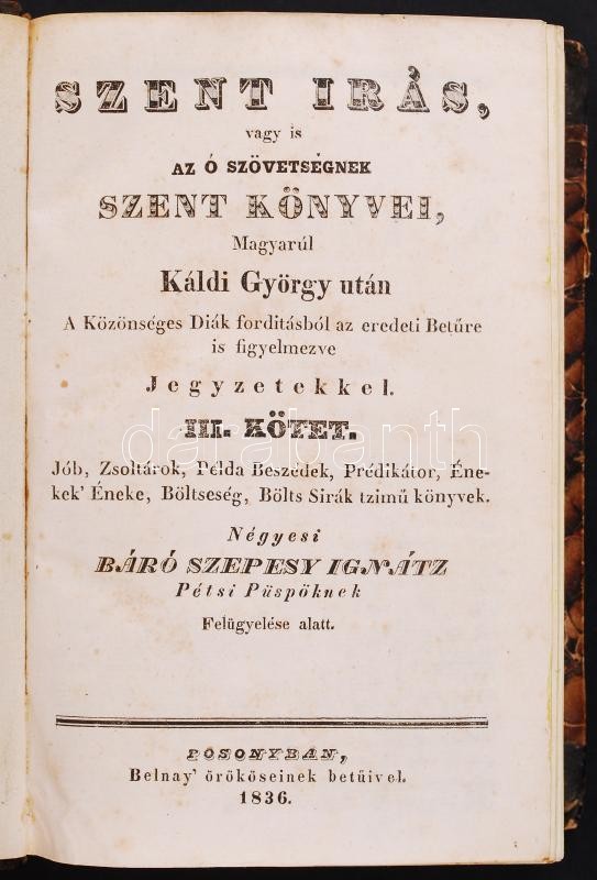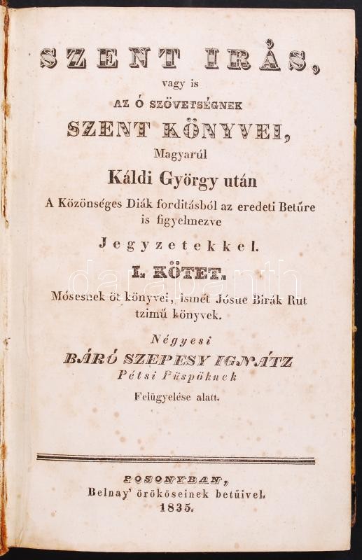 Szent Irás, vagy is az Ó Szövetségnek szent könyvei, Magyarúl Káldi György után. A Közönséges Diák forditásból az eredeti Betűre is figyelmezve. Jegyzetekkel. Négyesi báró Szepesy Ignátz Pétsi Püspöknek Felügyelése alatt. I-IV. kötet. Posonyban, 1835-1836, Belnay’ örököseinek betűivel. Korabeli, aranyozott gerincű félbőr kötésben, jó állapotban (a kötésen kopásokkal)