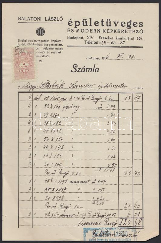 1937 Kitöltött számla, épületüveges és modern képkeretező, Balatoni L... https://www.darabanth.com/de/192-Fernauktion/192.0/Andere-Sammelgebiete/Dokument~2000021/1937-Kitoltott-szamla-epuletuveges-es-modern-kepkeretezo-Balatoni-Laszlo~II725483