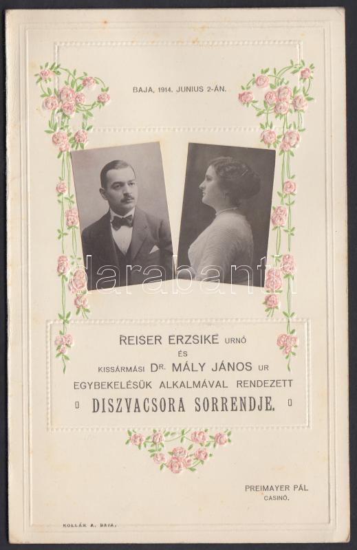 1914 Baja, esküvői menükártya, fotóval https://www.darabanth.com/de/192-Fernauktion/192.0/Andere-Sammelgebiete/Drucksachen~2000023/1914-Baja-eskuvoi-menukartya-fotoval~II725625