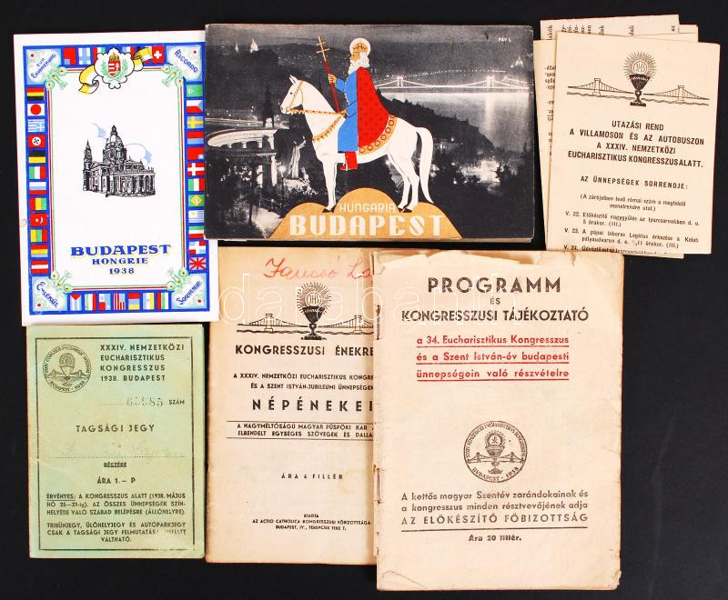 1938 Kis tétel a Budapesten megrendezett, XXXIV. Nemzetközi Eucharisztikus Kongresszus nyomtatványaiból: programfüzet, énekrend, tagsági jegy, képeslap, tájékoztató, etc.