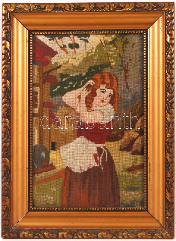 Haját igazgató lány. Gobelin, antik keretben, 44×32 cm https://www.darabanth.com/de/192-Fernauktion/192.0/Andere-Sammelgebiete/Flohmarkt~2000016/Hajat-igazgato-lany-Gobelin-antik-keretben--44C39732-cm~II725099