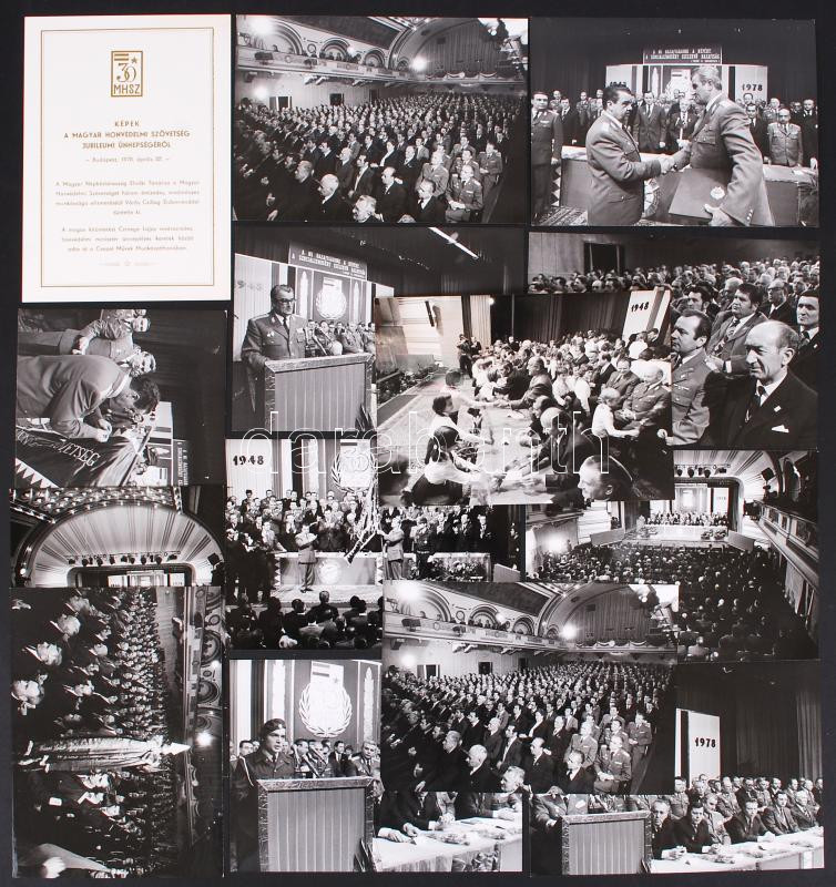 Beschreibung: 1978 13db fotó a 30 éves Magyar Honvédelmi Szövetség jubileumi ünnepségéről számos katonai főtiszt részvételével, mellékelve egy meghívó, 13x18cm