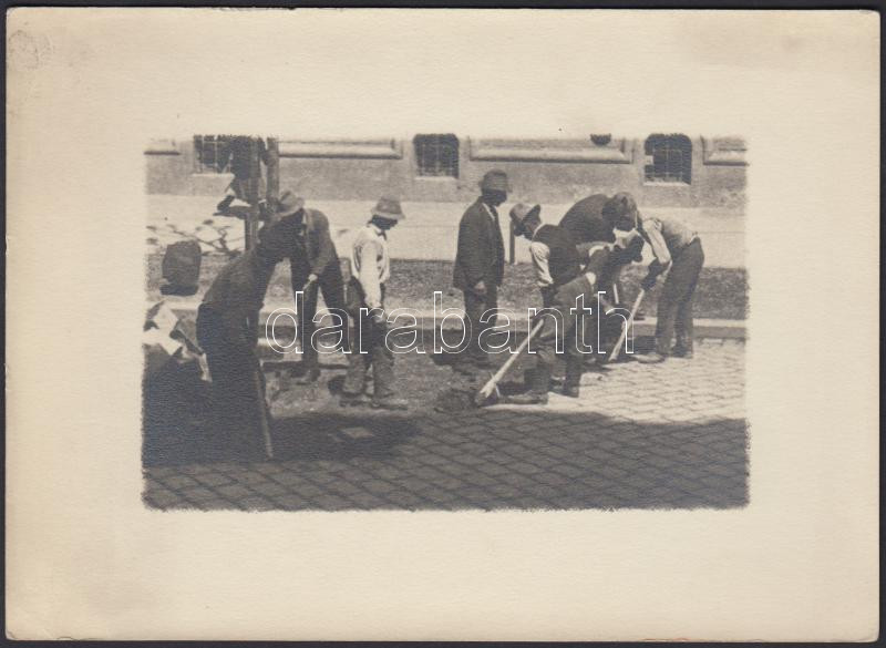 Cca 1940 Thöresz Dezső (1902-1963): Útjavító munkások. Szociofotó, vintage kópia, jelzetlen, a szerző hagyatékából származik, 13x18 cm-es fotópapíron a kép mérete 9x12 cm, ún. művészfólián keresztül másolva
