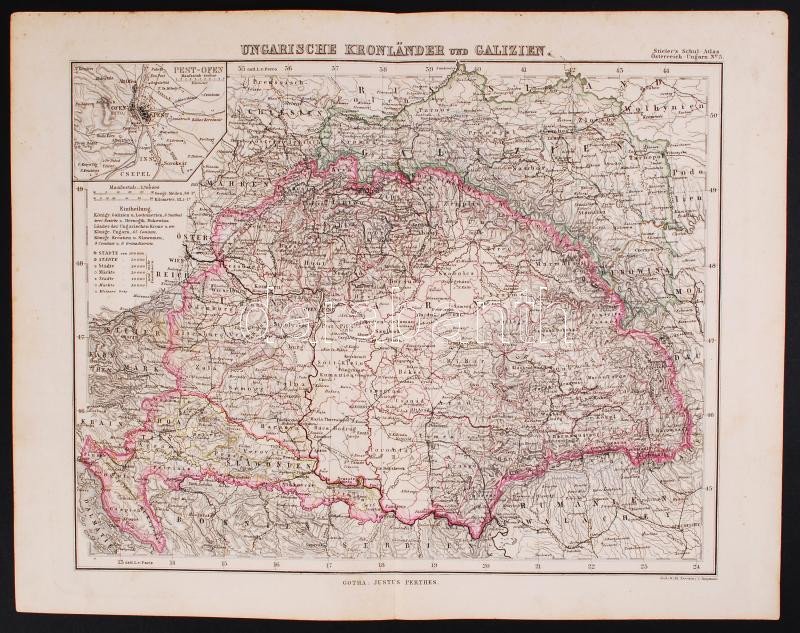 Hungarian Crown lands and Galicia. Colored etching, Stielers Schul-Atlas No. 5, Gotha, Justus Perthes, 24x29cm