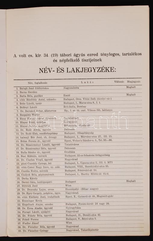 Beschreibung: 1932 A volt cs. kir. 34. (19) tábori ágyús ezred tényleges, tartalékos és népfelkelő tisztjeinek név- és lakjegyzéke