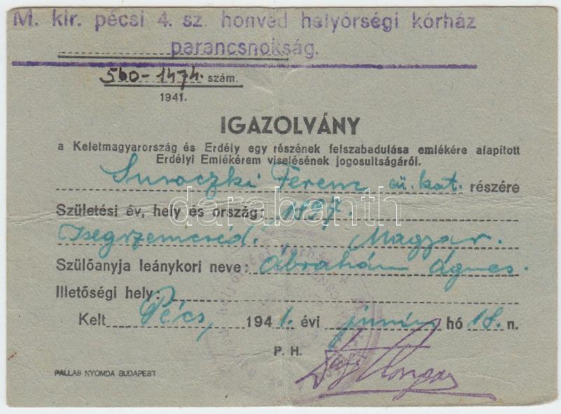 1941. Katonai igazolvány, az Erdélyi Emlékérem kitüntetések viselésér... https://www.darabanth.com/de/192-Fernauktion/192.0/Andere-Sammelgebiete/Militaria~2000017/1941-Katonai-igazolvany-az-Erdelyi-Emlekerem-kituntetesek-viselesere~II728610