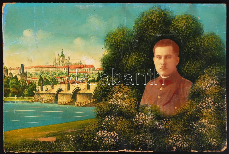 Beschreibung: Cca 1950 Ismeretlen szerző fotómontázsa. Katonai fénykép a szolgálati idő emlékére, prágai háttérrel, átfestve, színezve, 20x29 cm