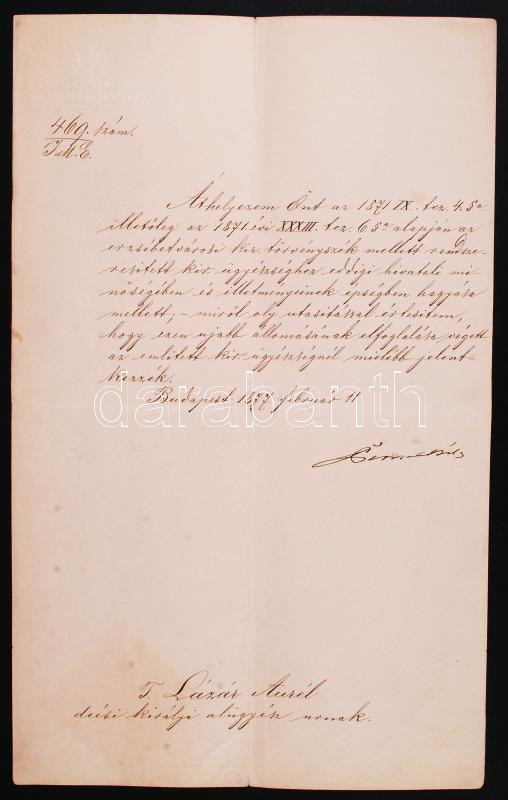Beschreibung: 1877 Perczel Béla igazságügyminiszter aláírása hivatalos okiraton