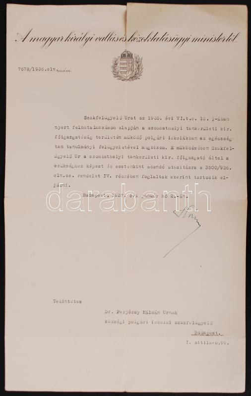 Beschreibung: 1937 Hóman Bálint aláírása vallás- és közoktatásügyi miniszterként miniszteri fejléces papíron