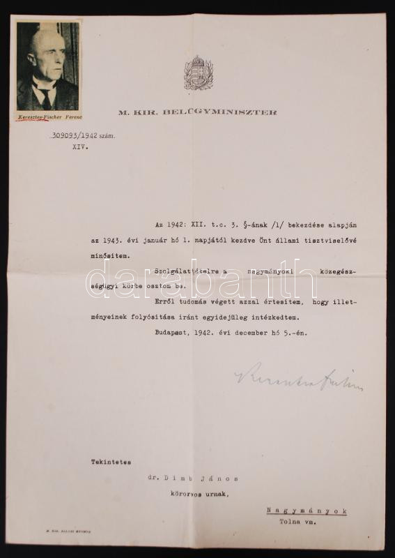 1942 Keresztes-Fischer Ferenc (1881-1948) között belügyminiszter (1938... https://www.darabanth.com/de/192-Fernauktion/192.0/Andere-Sammelgebiete/Signatur~2000024/1942-Keresztes-Fischer-Ferenc-1881-1948-kozott-belugyminiszter-1938-maj-24-1944-marc-22~II731704