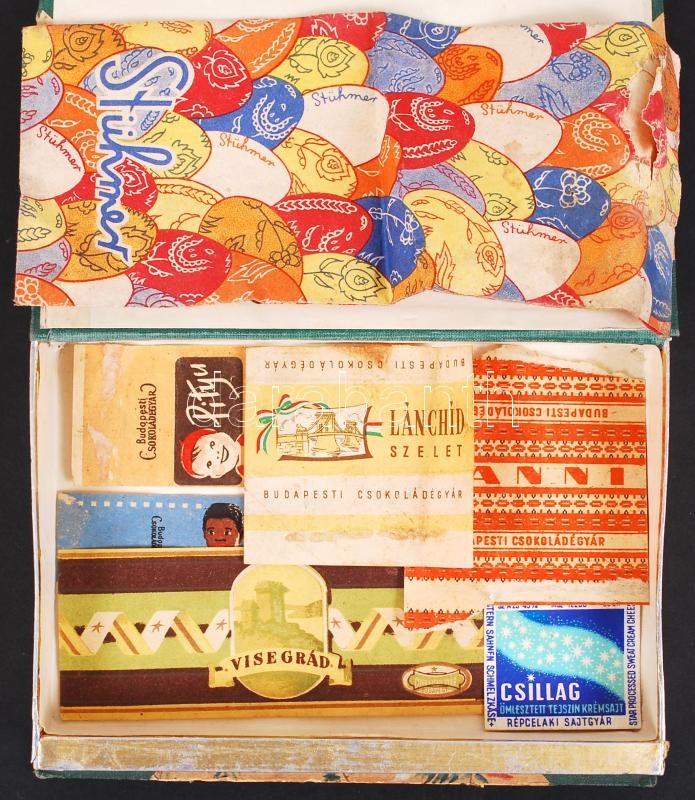 Beschreibung: Csokoládés reklám tétel, zavskó, csokipapír, bonbonos doboz