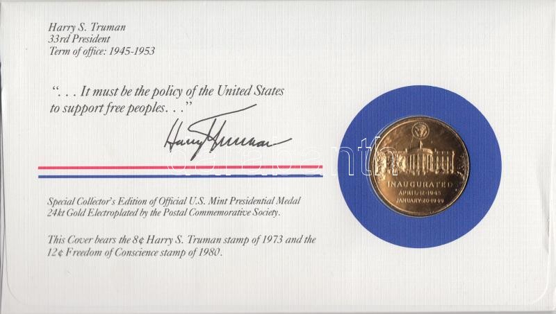 Amerikai Egyesült Államok 1983. 33. elnök "Harry S. Truman" aranyozott emlékérem érmés bélyeges borítékon alkalmi bélyegzővel T:1