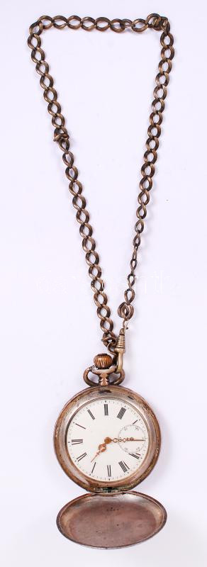 Beschreibung: Ezüst (Ag.) másodpercmutatós zsebóra, nem működik, jelzett,lánccal, fedele sérült, bruttó: 99 g / Silver pocketwatch