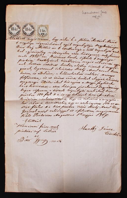 Beschreibung: 1867 Komáromi János pinkóci református lelkész (az író apja) által aláírt okmány