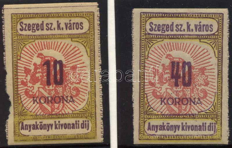 1920 Szeged 10K + 40K Anyakönyvi kivonati díj bélyegek https://www.darabanth.com/de/193-Fernauktion/193.0/Andere-Sammelgebiete/Stempelmarken~200013/1920-Szeged-10K-plus-40K-Anyakonyvi-kivonati-dij-belyegek~II720602