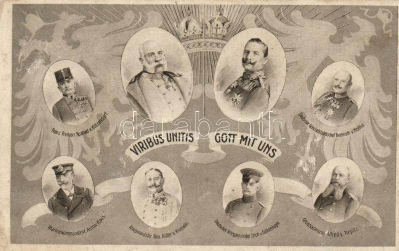Franz Joseph, Charles IV, Franz Conrad von Hötzendorf, Helmuth von Moltke, Anton Haus, Alexander von Krobatin, Erich von Falkenhayn, Alfred von Tirpitz