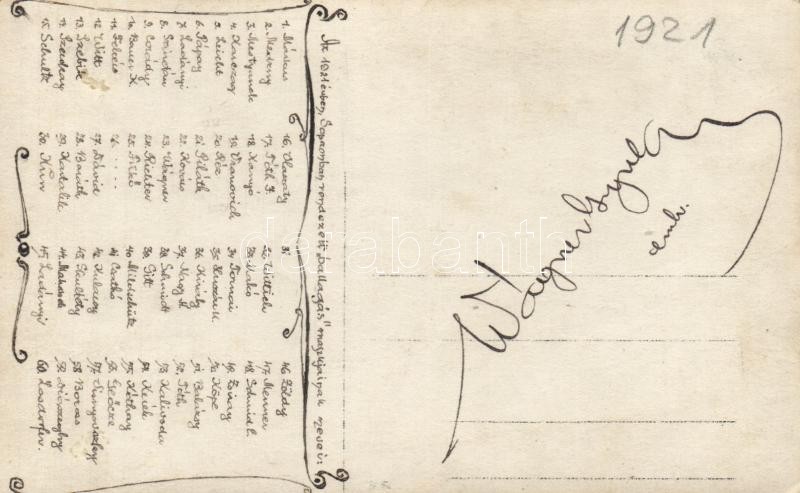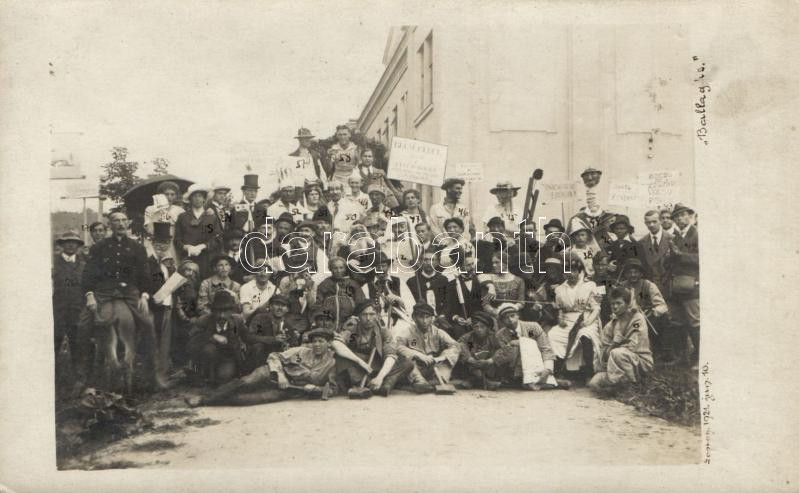 Beschreibung: 1921 Sopron, "bolondballagás", a képen szereplők nevei a hátoldalon, Studentika, photo