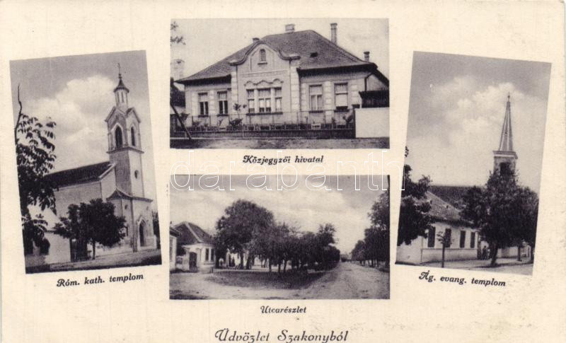 Beschreibung: Szakony, Római katolikus templom, Közjegyzői hivatal, Evangélikus templom