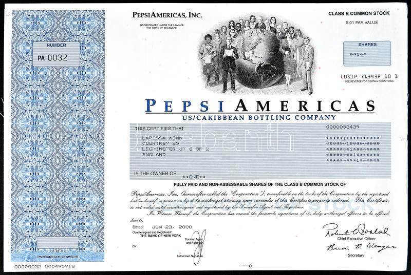 USA 2000. "Pepsi America US/Caribbean Bottling Company" 1 piece of B class share C:AU