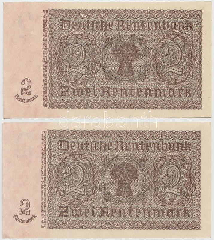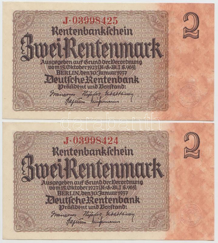 German Third Reich 1937. 2 Rentenmark (2x) sequential serials C:UNC,AU