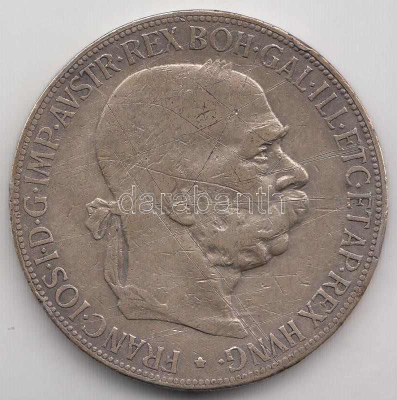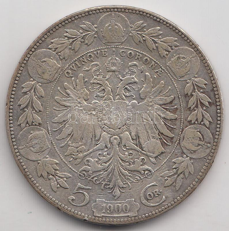 Austria 1900. 5 Corona Ag C:F https://www.darabanth.com/de/193-Fernauktion/193.0/Numismatik/Auslandische-Munzen~12/Ausztria-1900-5K-Ag-T3-3Cbr3EAustria-1900-5-Corona-Ag-CF~II732805
