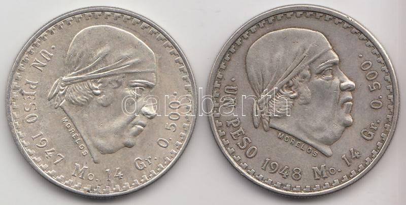 Mexico 1947. 1 Peso Ag + 1948. 1 Peso Ag C:VF,XF