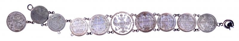 Russia 1909-1914. 10 Kopeks Ag (6x) + 15 Kopeks (3x) + 20 Kopeks Ag coins on bracelet C:mixed damaged