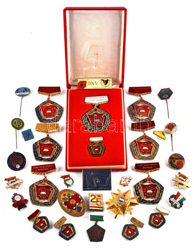 Beschreibung: 30db vegyes jelvény kitűző, kitüntetés a szocializmus korszakából + "A Vállalat Kiváló Ifjúsági Brigádja" kitüntetés kitűzővel tokban T:vegyes