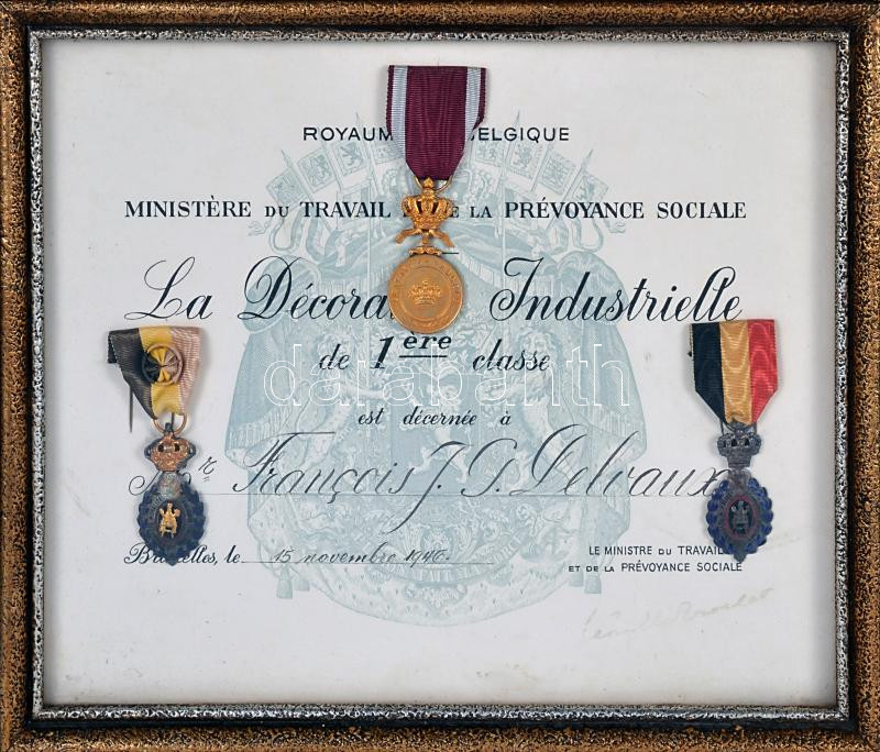 Belgium 1946. "Munkás kitüntetés első osztálya" adományozói ... https://www.darabanth.com/de/193-Fernauktion/193.0/Numismatik/Faleristik-Auszeichnungen-Medaillen-Ordnen~17/Belgium-1946-Munkas-kituntetes-elso-osztalya-adomanyozoi-okirata-bekeretezve-3db-kituntet~II717993