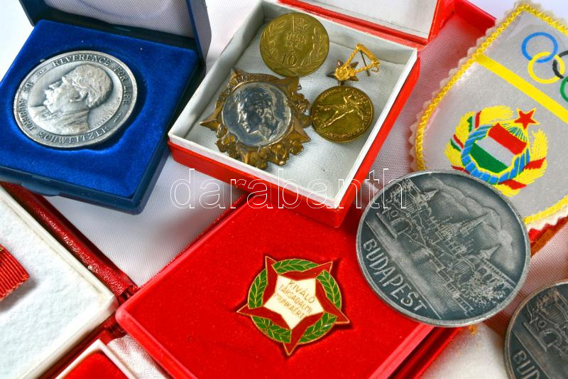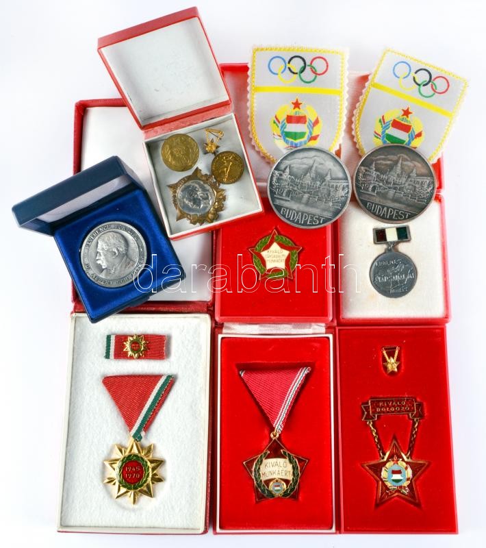 Vegyes emlékérem és szocialista kitüntetés tétel (9db), közte "Budapest" Br emlékérem (2x), "Kiváló Társadalmi Munkáért", "Kiváló Dolgozó" kitüntetés, mindegyik kitüntetés tokban T:vegyes