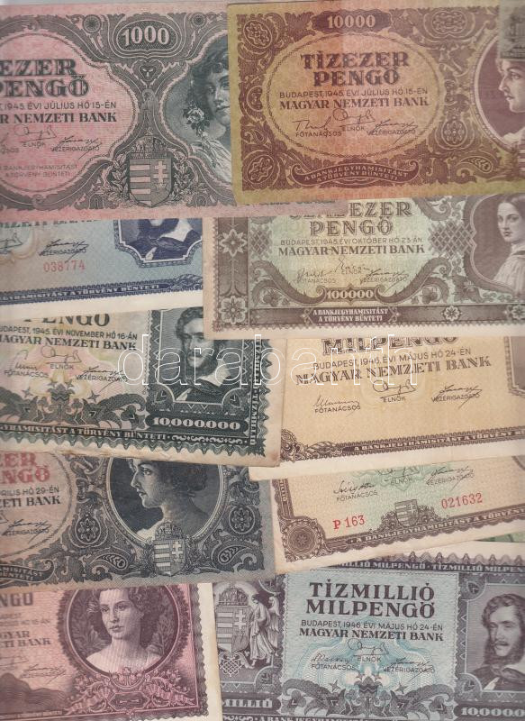 Beschreibung: 1945. 1000P bélyeg nélkül T:II- + 10.000P bélyeggel + 100.000P + 1.000.000P + 10.000.000P + 1946. 8db klf inflációs pengő T:vegyes