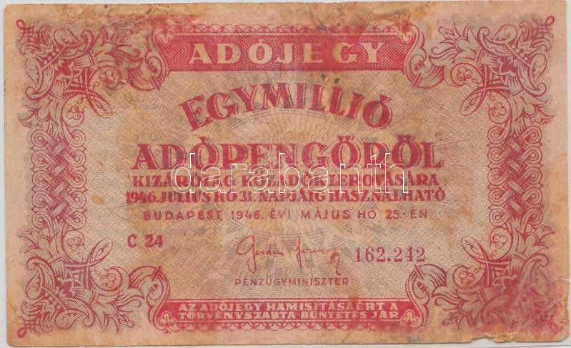 1946. 1.000.000AP fordított címerrel T:III- https://www.darabanth.com/de/193-Fernauktion/193.0/Numismatik/Ungarische-Banknoten~7/1946-1000000AP-forditott-cimerrel-TIII-~II677490
