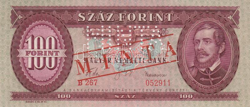 1960. 100Ft "MINTA" perforációval és felülnyomással "B ... https://www.darabanth.com/de/193-Fernauktion/193.0/Numismatik/Ungarische-Banknoten~7/1960-100Ft-MINTA-perforacioval-es-felulnyomassal-B-267-052911-TI~II735097