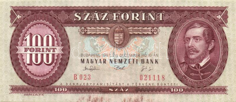Beschreibung: 1993. 100Ft (2x) egymás utáni sorszámmal és nyomdai festékfoltokkal T:I