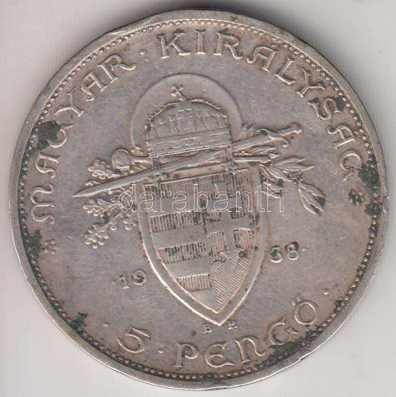 1938. 5P Ag "Szent István" T:2- https://www.darabanth.com/de/193-Fernauktion/193.0/Numismatik/Ungarische-Munzen~8/1938-5P-Ag-Szent-Istvan-T2-~II733911