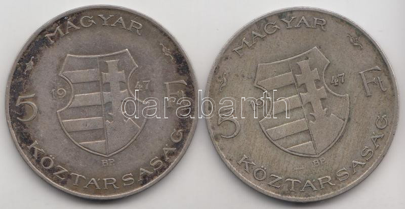 1947. 5Ft Ag "Kossuth" (2x) T:2- https://www.darabanth.com/de/193-Fernauktion/193.0/Numismatik/Ungarische-Munzen~8/1947-5Ft-Ag-Kossuth-2x-T2-~II736872