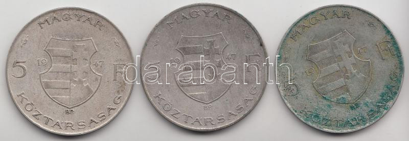 1947. 5Ft Ag "Kossuth" (3x) T:3 https://www.darabanth.com/de/193-Fernauktion/193.0/Numismatik/Ungarische-Munzen~8/1947-5Ft-Ag-Kossuth-3x-T3~II732779