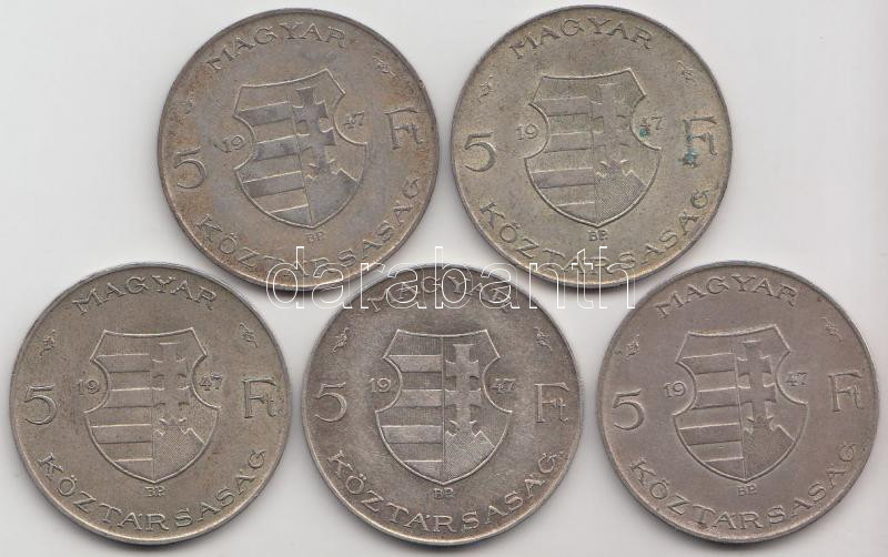 1947. 5Ft Ag "Kossuth" T:vegyes https://www.darabanth.com/de/193-Fernauktion/193.0/Numismatik/Ungarische-Munzen~8/1947-5Ft-Ag-Kossuth-Tvegyes~II735014
