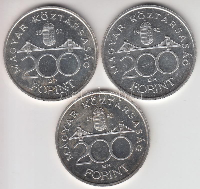 1992. 200Ft Ag "MNB" (3x) T:2 https://www.darabanth.com/de/193-Fernauktion/193.0/Numismatik/Ungarische-Munzen~8/1992-200Ft-Ag-MNB-3x-T2~II737283