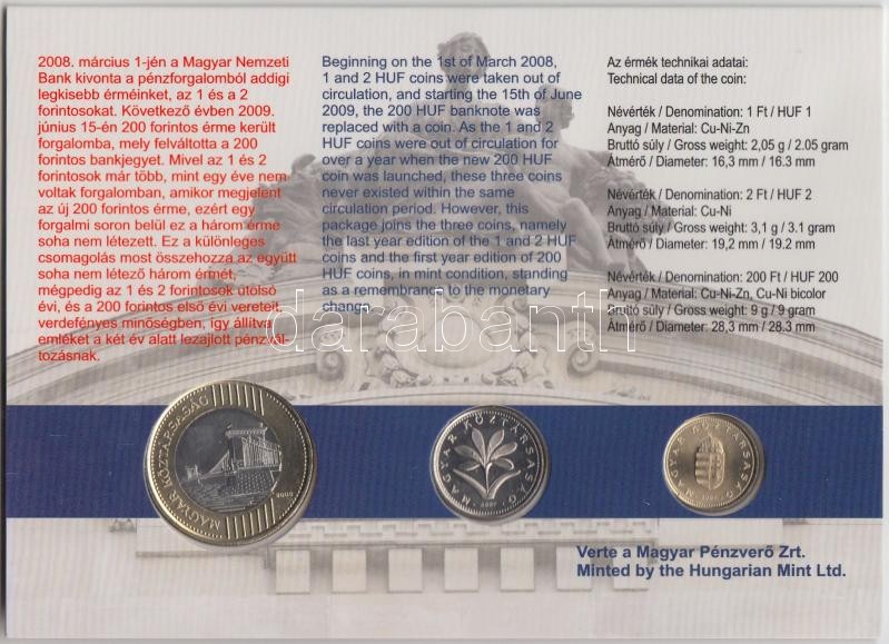 2007. 1Ft + 2Ft + 2009. 200Ft "Pénzváltozás" kivont forgalmi... https://www.darabanth.com/de/193-Fernauktion/193.0/Numismatik/Ungarische-Munzen~8/2007-1Ft-plus-2Ft-plus-2009-200Ft-Penzvaltozas-kivont-forgalmi-penzeink-es-az-uj-200Ft-os-egyut~II733067
