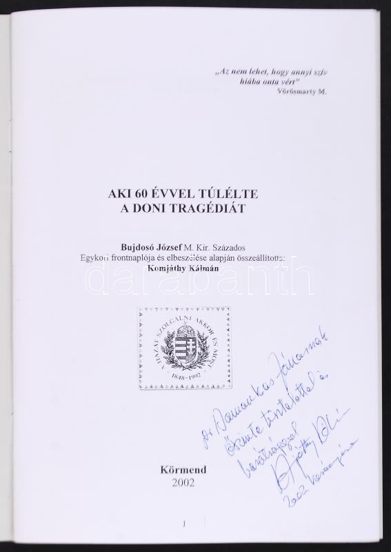 Komjáthy Kálmán: Aki 60 évvel túlélte a don-i tragédiát. Körmend 2002.... https://www.darabanth.com/de/194-Fernauktion/194.0/Andere-Sammelgebiete/Bucher-Militaria~600029/Komjathy-Kalman-Aki-60-evvel-tulelte-a-don-i-tragediat-Kormend-2002-Magankiadvany~II739764